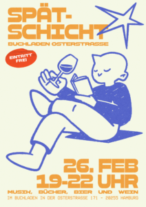 Unser neuestes Format geht in die vierte Runde! Die Spätschicht soll mehrmals im Jahr ein kleines Zusammenkommen im Buchladen sein, offen für alle, ohne Eintritt, dafür mit Getränken. Ein kleines Programm wird es geben, zwischen 19 und 22 Uhr seid ihr eingeladen und ihr könnt kommen, wie immer es euch passt. Wir freuen uns auf euren Besuch.